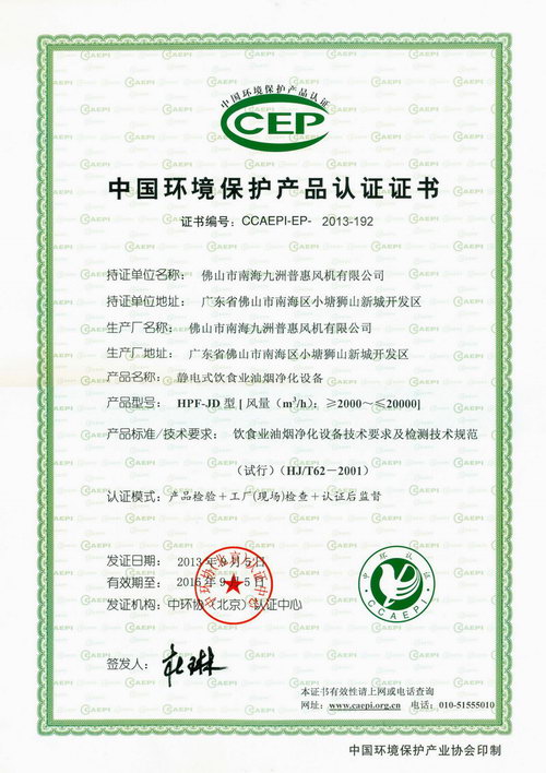 九洲普惠风机厂喜获中国环境保护产品认证